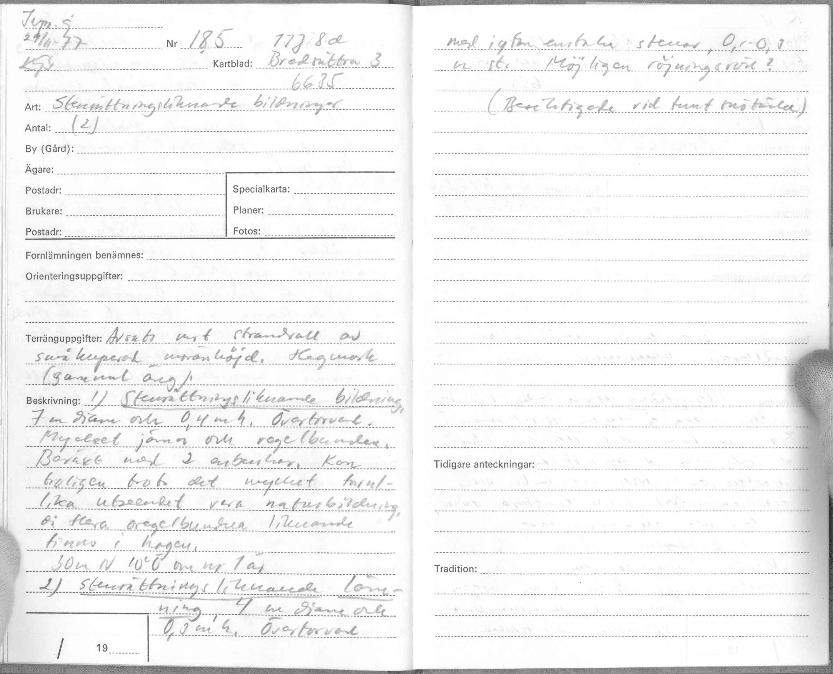 1) Stensättningsliknande bildning, 7 m diam och 0,4 m h. Övertorvad. Mycket jämn och regelbunden. Beväxt med 2 enbuskar.Kan troligen trots det mycket fornlika utseendet vara naturbildning, då flera oregelbundna liknande finns i hagen. 30 mN 10cg Ö om nr 1 är: 2) Stensättningsliknande lämning, 4 m diamoch 0,3 m h. Övertorvad med i ytan enstaka stenar, 0,1-0,3 m st. Möjligen röjningsröse? (Besiktigade vid tunnt snötäcke).